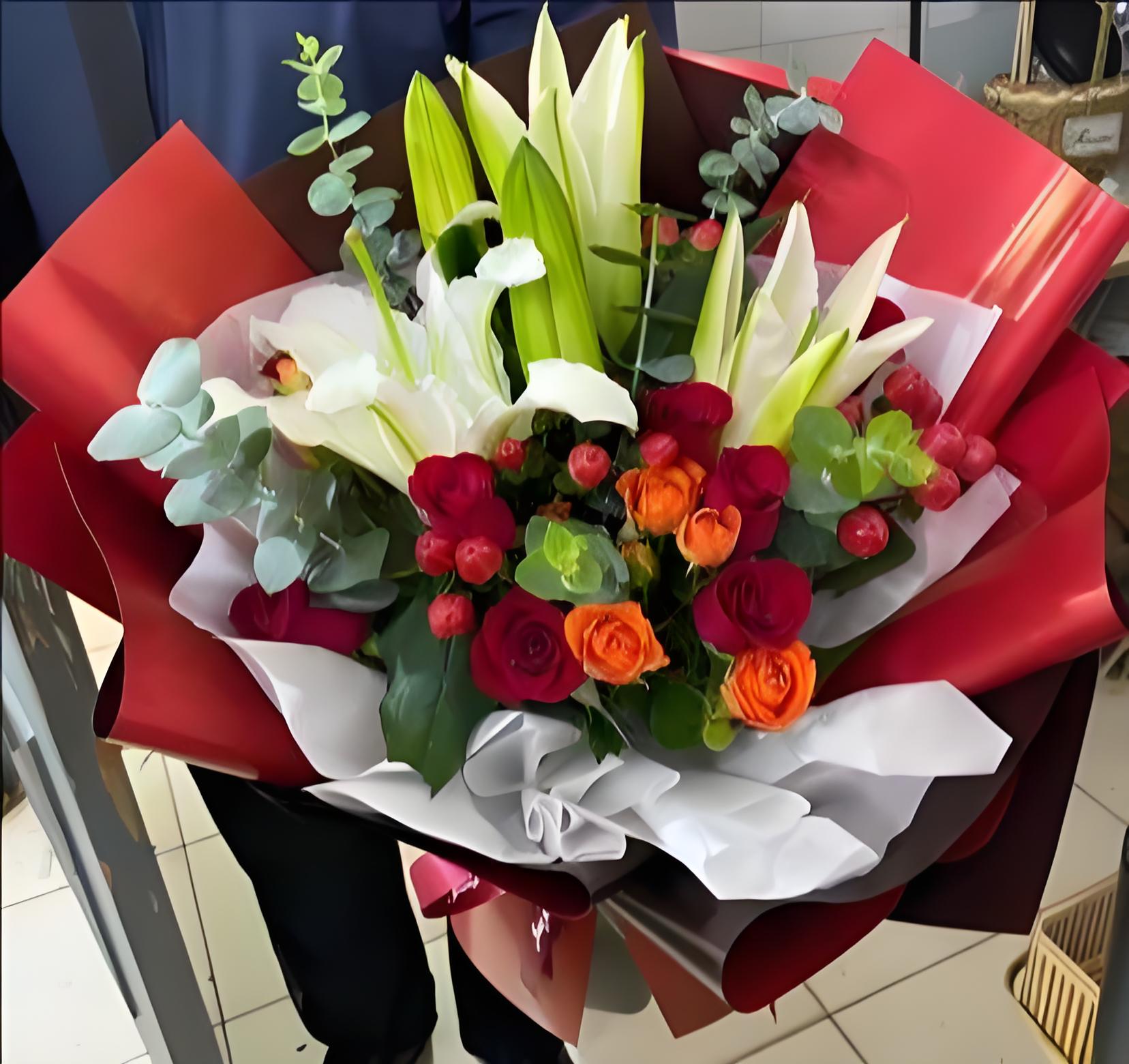 呼伦贝尔牙克石花店包11枝红玫瑰、2枝多头白百合、6枝橙色多头玫瑰、红豆、尤加利叶